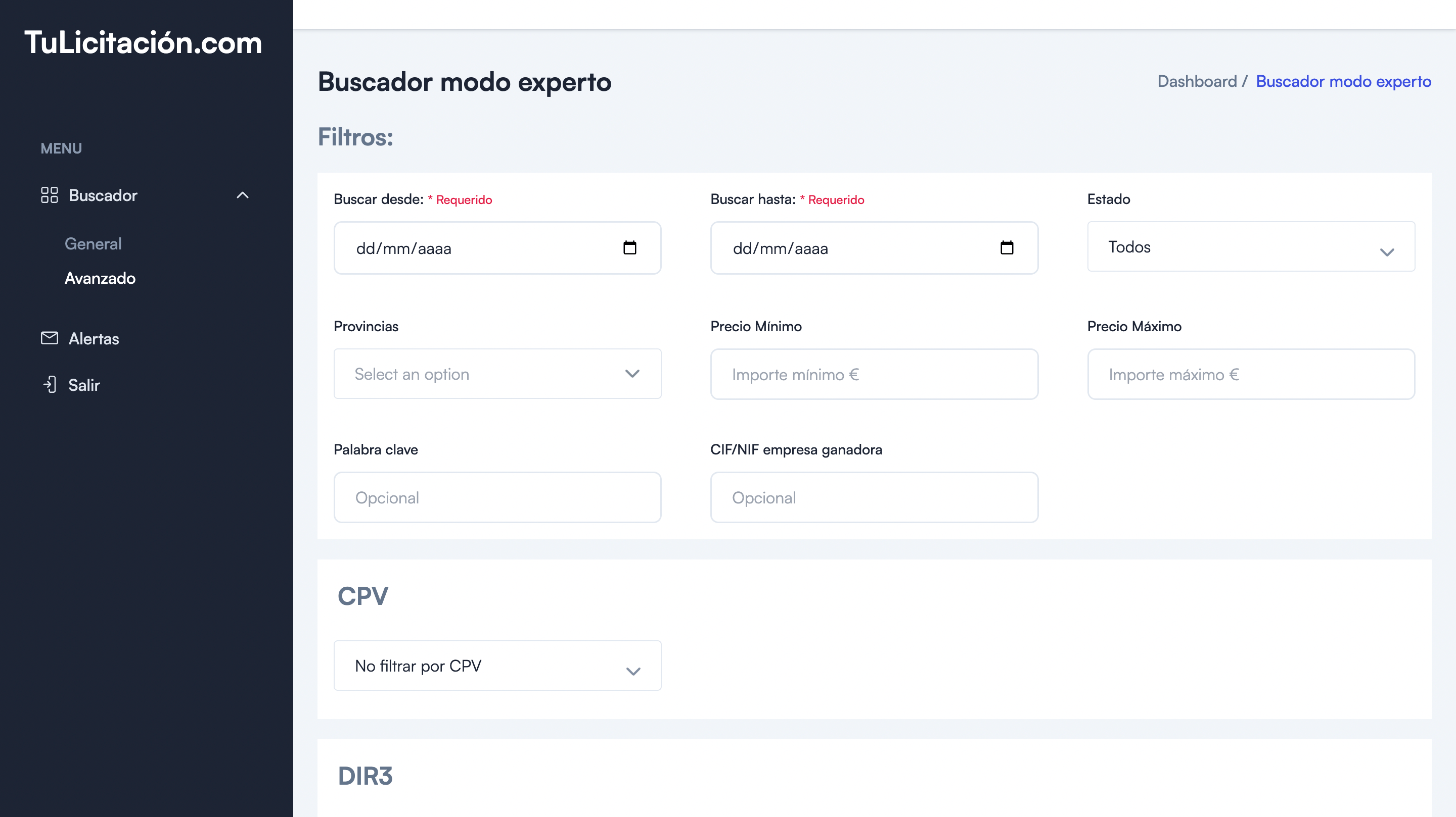Con nuestra plataforma, podrás filtrar licitaciones por provincias, códigos CPV, organismos, rangos de precios, códigos DIR3 y mucho más. Esto te permite focalizar tus esfuerzos en aquellas oportunidades que realmente importan, ahorrando tiempo y recursos en el proceso de búsqueda.